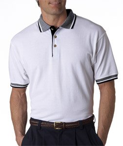 8536 UltraClub Adult White-Body Classic Pique Polo with Contrasting Multi-Stripe Trim. Soft, comfortable, stylish polos that will make accounting smile. Preshrunk 100% cotton 6.2-oz. Relaxed Fit Taped neck Half-moon patch Side vents Wood-tone buttons Sizes: S through 4XL.