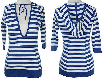 Pink Rose stretch knit pullover has a solid rib knit band trimming the drawstring hood and plunging v-neckline. There are three-quarter sleeves. The cuffs and bottom hem are finished with a rib-knit band.