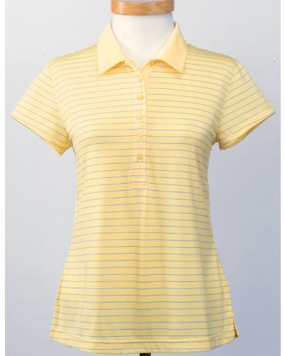 Tri-Mountain Women's Ultracool Three-Color Stripe Golf Short Sleeve Shirt. 121, You don't let anything get in your way, why let the heat? This women's 5.3 oz. 100% polyester yarn-dyed golf shirt features Tri-Mountain UltraCoolTM moisture wicking technology that lifts perspiration from your skin, providing comfort on the hottest of days. Three-color striped body. Accented with a fitted silhouette cut with a self-fabric collar and narrow 6-button placket. Small capped open sleeves and square bottom with side vents.