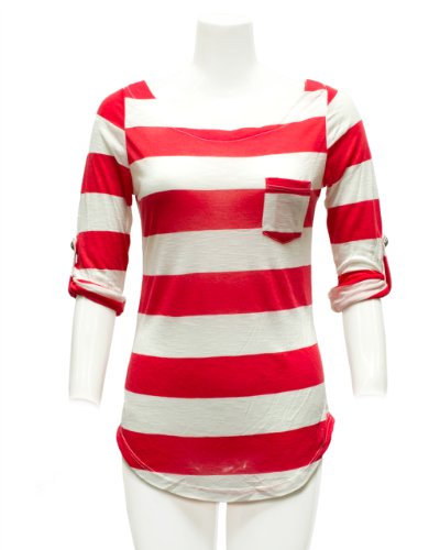 Ladies Red White Striped Roll Up Button Sleeve Pocket Top |FineBrandShop | Reviews