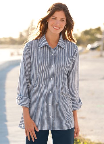 Inspired by classic men's shirting, our feminine tunic shirt is graced with rows of pintucks across the bodice. Traditionally detailed with a point collar and button cuffs, it has a slightly A-line shape and straight hem. Long striped tunic shirt in blue/white, red/white. Pure cotton. Washable. Imported. Sizes: XS(4), S(6-8), M(10-12), L(14-16), XL(18-20); about 29" long.