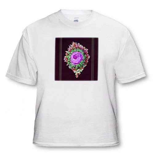 Purple rose, green and red flower bouquet with green and white striped ribbon T-Shirt is commercial quality high resolution heat transfers garment. 5.6-ounce, 50-50 cotton-poly; taped shoulder to shoulder, coverseamed ribbed collar, double-needle sleeve and bottom hem. Toddler and infant t-shirts are 4.1-ounce. 100% ring spun combed cotton. Our image transfer produces professional matte finish with Premium Quality and Superior image resolution. Colors do not bleed and the image is sharp and crisp. Available in white, gray, blue and pink. Washing Instructions: 1. Turn Garment inside-out and machine wash in cold water. 2. Do not use Bleach or Fabric Softener. 3. Detergents with bleach additives are not recommended. 4. Tumble Dry on Warm. 5. Do not Iron. Do not Dry clean.
